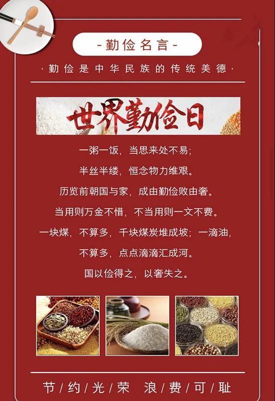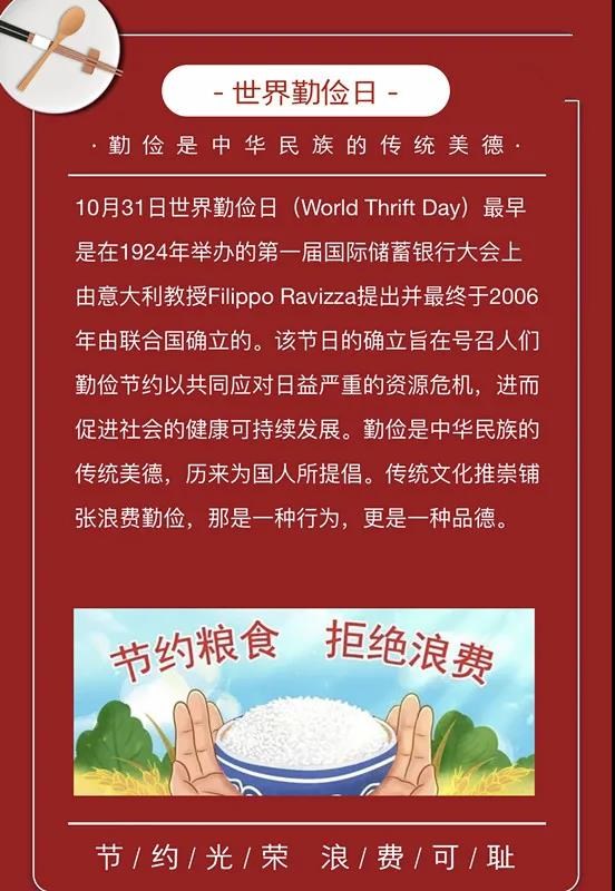 10月31日是 “世界勤俭日”。勤俭节约是我们中华民族的传统美德,也是我们民族世代相传的精神财富。从身边小事做起,从现在做起,把勤俭节约变成一种习惯,为建设节约型社会贡献一份自己的力量。