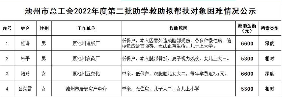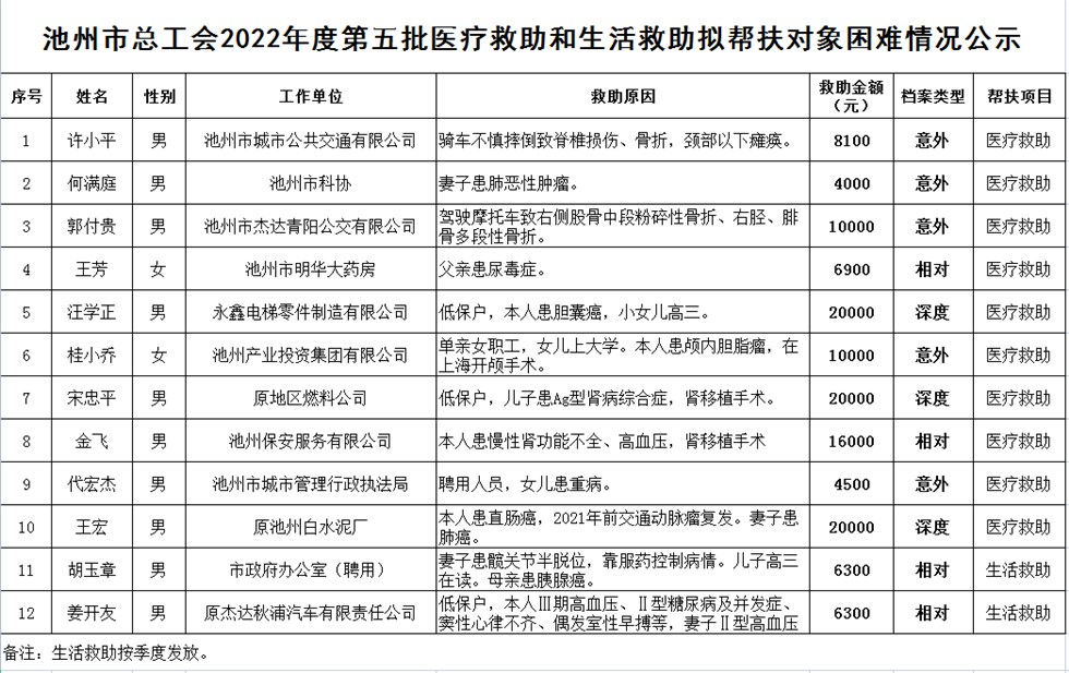 经职工申请,基层工会初审,市总工会权益保障部审核,市总工会拟对第五批10名困难职工家庭提供医疗救助帮扶、第五批2名困难职工家庭提供生活救助帮扶、第二批4名困难职工家庭提供助学救助帮扶。为广泛听取社会各界意见,接受公众监督,体现公开、公平、公正原则,现将拟帮扶对象困难情况予以公示,公示期为工作日5日,公示时间为2022年7月18日至7月22日。如有不同意见,请与市总工会权益保障部联系,联系电话:2088151。
