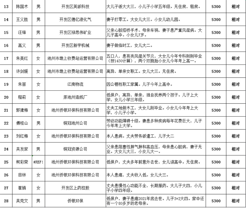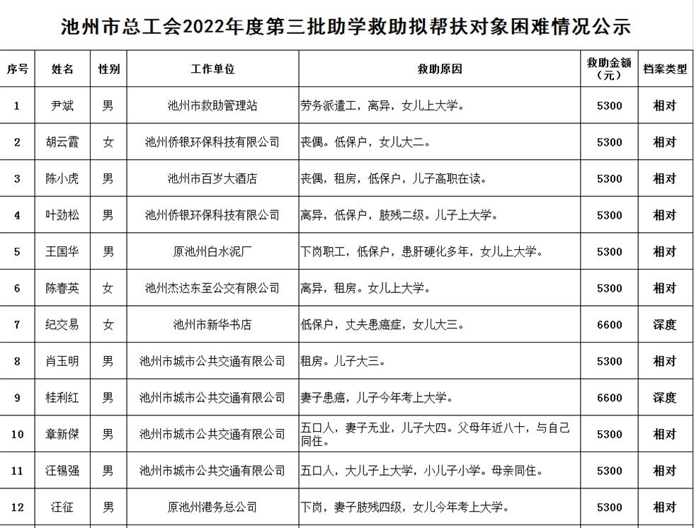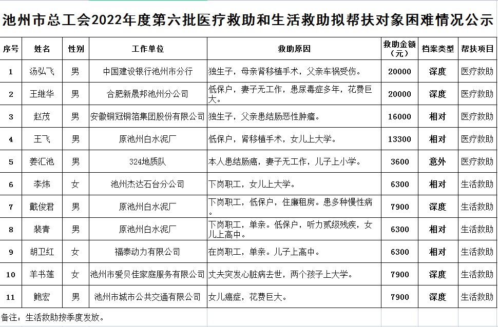 经职工申请,基层工会初审,市总工会权益保障部审核,市总工会拟对第六批5名困难职工家庭提供医疗救助帮扶、第六批6名困难职工家庭提供生活救助帮扶、第三批28名困难职工家庭提供助学救助帮扶。为广泛听取社会各界意见,接受公众监督,体现公开、公平、公正原则,现将拟帮扶对象困难情况予以公示,公示期为工作日5日,公示时间为2022年9月13日至9月19日。如有不同意见,请与市总工会权益保障部联系,联系电话:2088151。