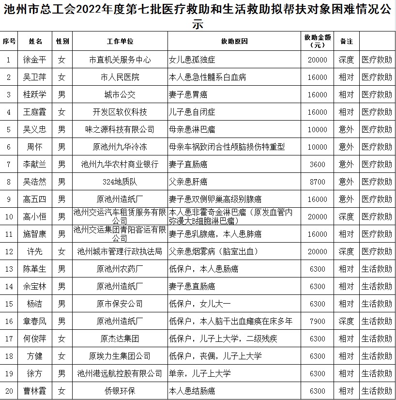 经职工申请,基层工会初审,市总工会权益保障部审核,市总工会拟对第七批12名困难职工家庭提供医疗救助帮扶、第七批8名困难职工家庭提供生活救助帮扶。为广泛听取社会各界意见,接受公众监督,体现公开、公平、公正原则,现将拟帮扶对象困难情况予以公示,公示期为工作日5日,公示时间为2022年12月12日至12月16日。如有不同意见,请与市总工会职工服务中心联系,联系电话:2088151。
