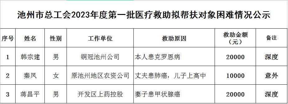 经职工申请,基层工会初审,市总工会权益保障部审核,市总工会拟对第一批3名困难职工家庭提供医疗救助帮扶。为广泛听取社会各界意见,接受公众监督,体现公开、公平、公正原则,现将拟帮扶对象困难情况予以公示,公示期为工作日5日,公示时间为2022年12月30日至2023年1月6日。如有不同意见,请与市总工会权益保障部联系,联系电话:2088151。