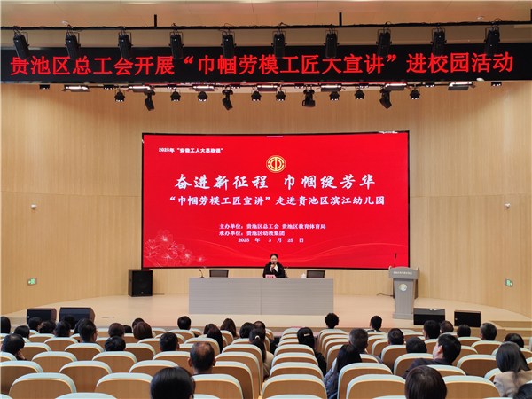 3 月 25 日上午,由贵池区总工会联合贵池区教育体育局主办的 “奋进新征程 巾帼绽芳华” 巾帼劳模工匠宣讲进校园活动在贵池区幼教集团滨江幼儿园举行。此次活动邀请了 “安徽省劳动模范” 贵池区古舜社区党委书记汪绍琴为主讲人。